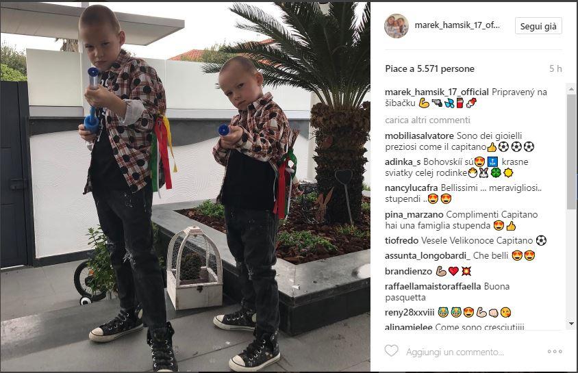 Tramite il suo profilo Instagram il numero 17 slovacco ha pubblicato una foto che ritrae i ragazzini in attesa del padre. “marek_hamsik_17_officialPripravený na šibačku 💪🔫💦🍫🍬” (pronti a colpire) ha commentato Marek.