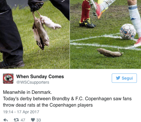 Quando il giocatore ospite Augustinsson si è recato sotto il settore degli ultrà di casa per battere un calcio d’angolo, i tifosi del Brondby hanno superato ogni limite di decenza, lanciando in campo, precisamente verso i giocatori della squadra avversaria, dei topi morti. Un episodio che rischia di diventare esempio negativo per i tifosi, comne lo è stato il “Clasico” di Spagna del 2002, quando gli ultrà del Barcellona diedero il benvenuto al “traditore” Luis Figo lanciandogli contro una testa di maiale.