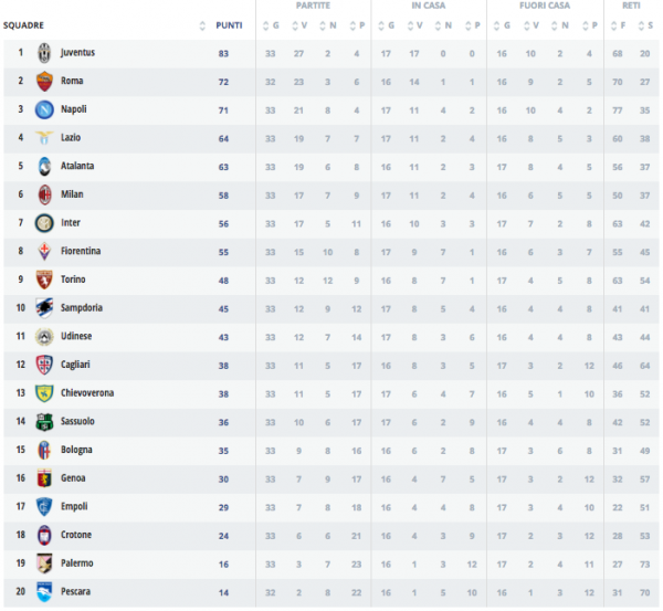 A cinque giornate dalla fine, lo scudetto sembra ormai assegnato. A rivincerlo, per la sesta volta consecutiva, sarà la Juventus, che questa sera ha battuto il Genoa con un netto 4-0.