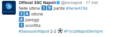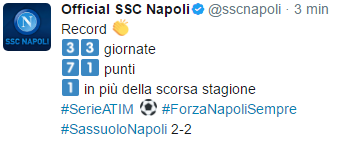 Il profilo Twitter ufficiale della Ssc Napoli ha aggiornato i dati riguardanti l’annata azzurra. Sono 71 i punti raccolti finora, uno in più rispetto allo scorso anno. Oltre a ciò, nelle ultime 19 giornate, 14 vittorie, 4 pareggi e 1 sconfitta