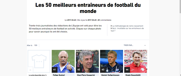 Il tecnico del Napoli appare sulla copertina della Top 50 e sicuramente figura nei primi quaranta. Sul sito del giornale transalpino, infatti, sono stati inseriti gli allenatori dal 41° al 50° posto: Scolari, Gasperini (42°), Hallgrimsson, Hasenhüttl, Coleman, Van Branckhorst, Howe, Lagerbäck, Pizzi, La Volpe).