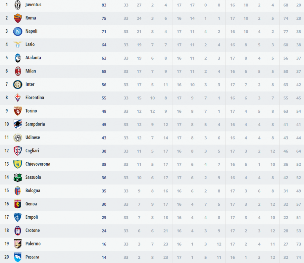Gli abruzzesi, invece, retrocedono aritmeticamente in Serie B: a cinque gare dal termine soltanto 14 punti conquistati, ben 15 in meno dell’Empoli che ha anche gli scontri diretti a favore. È la seconda volta in quattro anni che il Pescara non riescere a raggiungere la salvezza dopo la promozione.