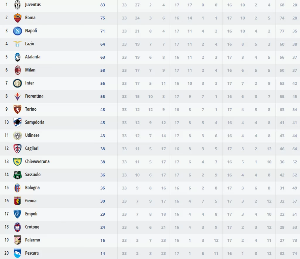 Gli abruzzesi, invece, retrocedono aritmeticamente in Serie B: a cinque gare dal termine soltanto 14 punti conquistati, ben 15 in meno dell’Empoli che ha anche gli scontri diretti a favore. È la seconda volta in quattro anni che il Pescara non riescere a raggiungere la salvezza dopo la promozione.