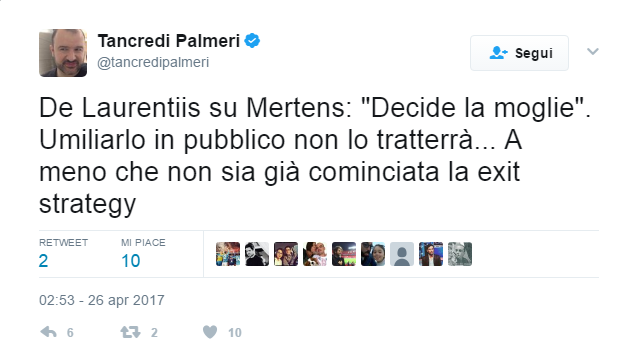 Tancredi Palmeri, giornalista e collaboratore di beIN Sports, ha commentato con un Tweet le dichiarazioni del presidente De Laurentiis. Ecco il Tweet: