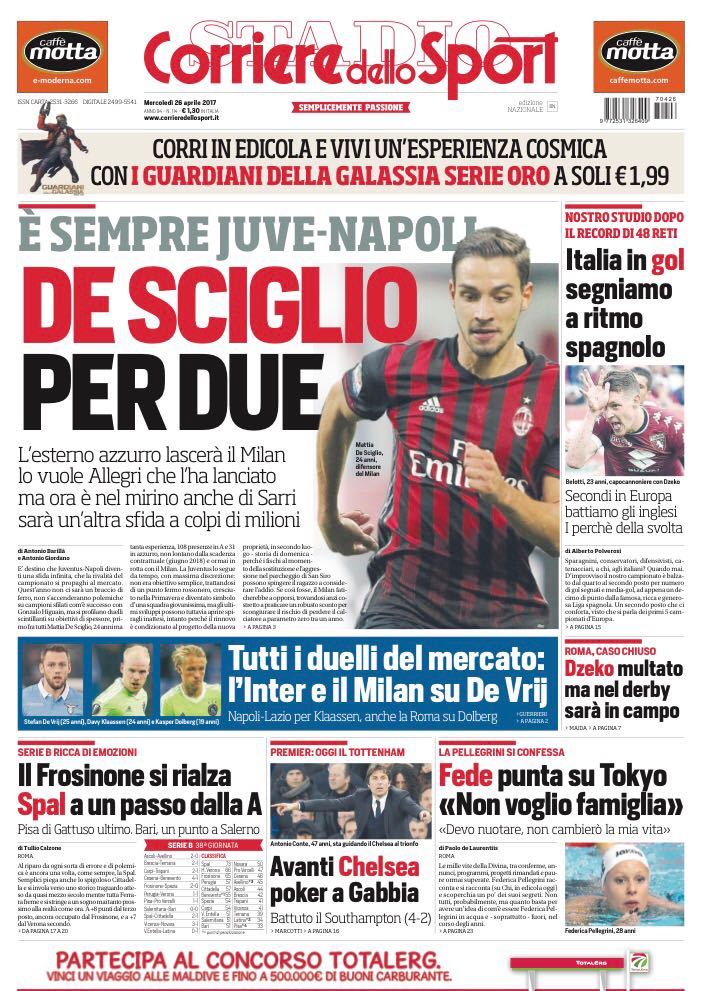 Il Corriere dello Sport infatti titola: “È sempre Juve-Napoli, De Sciglio per due“. Poi spazio agli altri duelli di mercato: “L’Inter e il Milan su De Vrij“.