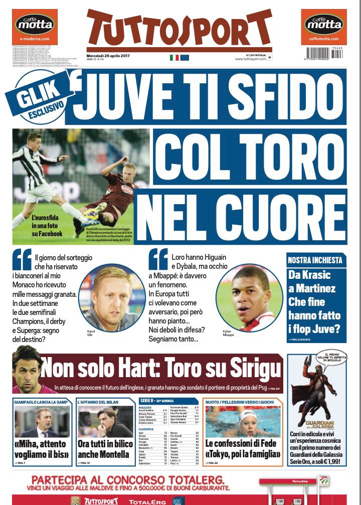 Tuttosport invece apre con l’intervista esclusiva a Glik: “Juve ti sfido col Toro nel cuore“. Ecco poi l’inchiesta del quotidiano: “Che fine hanno fatto i flop Juve“. In taglio basso spazio al Torino: “Non solo Hart, Toro su Sirigu“.