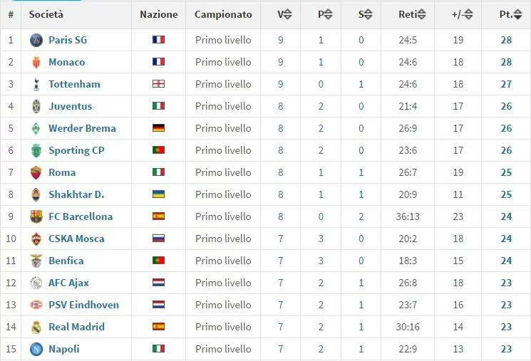 Nella consueta classifica delle squadre più in forma d’Europa pubblicata periodicamente dall’autorevole portale Transfermarkt, compare anche il Napoli. Gli azzurri ricoprono la posizione numero 15 nella classifica a pari punti con il Real Madrid (23 punti totalizzati). La prima italiana è la Juventus con 26 punti (posizione numero 4), in una tabella governata dalle due francesi: Monaco e PSG entrambe a 28 punti.
