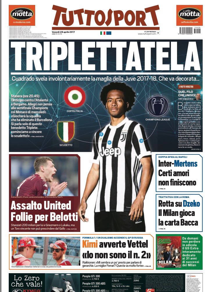 In prima pagina su Tuttosport: “Triplettatela“, questo invece il titolo scelto a causa di Cuadrado che svela involontariamente la maglia della Juventus per la stagione 2017-18. In basso spazio al mercato attaccanti con il Manchester United pronto a fare follie per Belotti. Campanello d’allarme per il Napoli: “Inter-Mertens, certi amori non finiscono“. Ed ecco infine il Milan che vira su Dzeko con Bacca come possibile pedina di scambio.