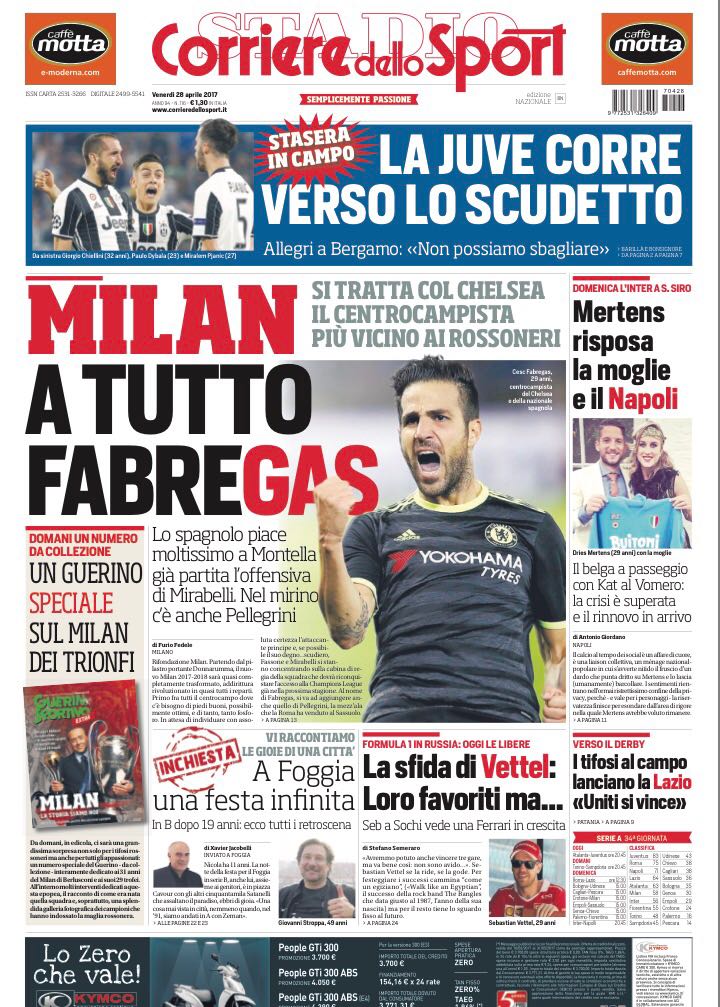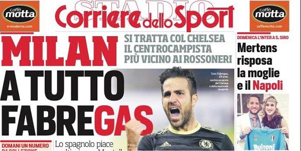 Il Corriere dello Sport apre con: “Milan a tutto Fabregas“, con lo spagnolo che piace a Montella e Mirabelli per l’estate. Sul Napoli troviamo: “Mertens risposa la moglie e il Napoli“. De Laurentis pronto a rinnovare il contratto al belga.