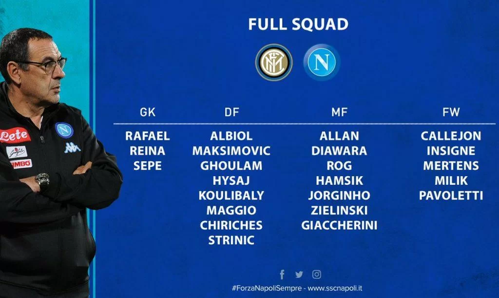 I convocati: Reina, Rafael, Sepe, Albiol, Chiriches, Ghoulam, Hysaj, Koulibaly, Maksimovic, Maggio, Strinic, Jorginho, Allan, Diawara, Hamsik, Rog, Zielinski, Giaccherini, Callejon, Insigne, Mertens, Milik, Pavoletti.