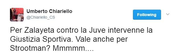 Successivamente il discorso si è spostato sul centrocampista olandese, facendo un paragona con un precedente che vedeva coinvolto l’ex attaccante del Napoli, Marcelo Zalayeta: “Per Zalayeta contro la Juve intervenne la Giustizia Sportiva. Vale anche per Strootman? Mmmmm….“. Il riferimento è ad una squalifica comminata dalla giustizia sportiva al centravanti uruguayano per una simulazione in Napoli-Juventus del 2007, con l’ex arbitro Bergonzi che assegnò il penalty agli azzurri per presunto fallo di Buffon.