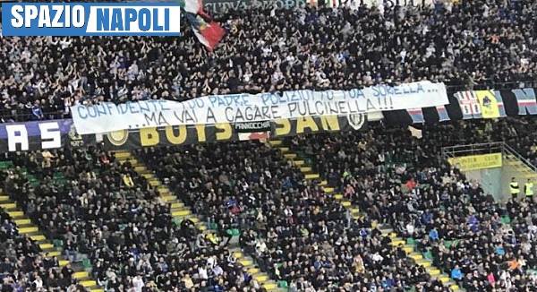 Al riguardo, i sostenitori nerazzurri si sono lasciati andare a cori di ogni genere contro Napoli. Inoltre dalla curva dello stadio sono stati esposti due striscioni: uno nei confronti dei napoletani (definiti Pulcinella), l’altro verso la curva A.