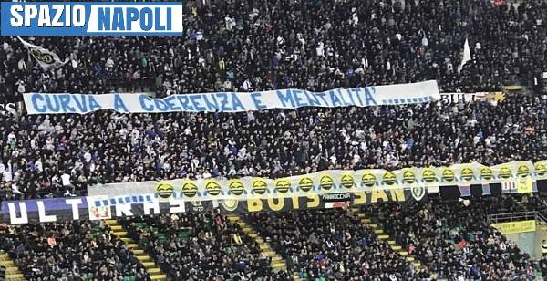 Al riguardo, i sostenitori nerazzurri si sono lasciati andare a cori di ogni genere contro Napoli. Inoltre dalla curva dello stadio sono stati esposti due striscioni: uno nei confronti dei napoletani (definiti Pulcinella), l’altro verso la curva A.