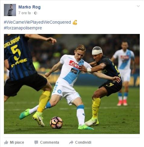 Una volta terminato il match, come ormai fanno molti giocatori, si è lasciato andare ad un’esultanza ‘social’. Il classe ’95, infatti, tramite il suo profilo ufficiale di Facebook, ha pubblicato una foto, riguardante proprio il match di ieri sera, che lo ritrae in azione palla al piede. Insieme all’appena citata foto, ha commentato con due frasi, piccole ma molto significative: “Siamo venuti, abbiamo giocato e abbiamo conquistato” (che lui ha scritto in inglese ‘We came, we played, we conquered’) e “Forza Napoli sempre”.