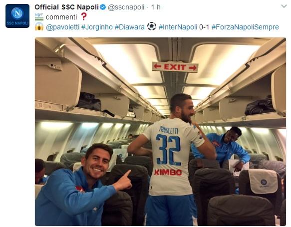 A testimoniarlo sono due foto pubblicate su Twitter. La prima è dello stesso club partenopeo che ritrae Pavoletti, ancora in divisa da gioco, insieme a Jorginho e Diawara. Particolare la descrizione del Napoli che scrive: “Commenti?“, incitando i tifosi a dire qualcosa, magari di simpatico, sulla foto.