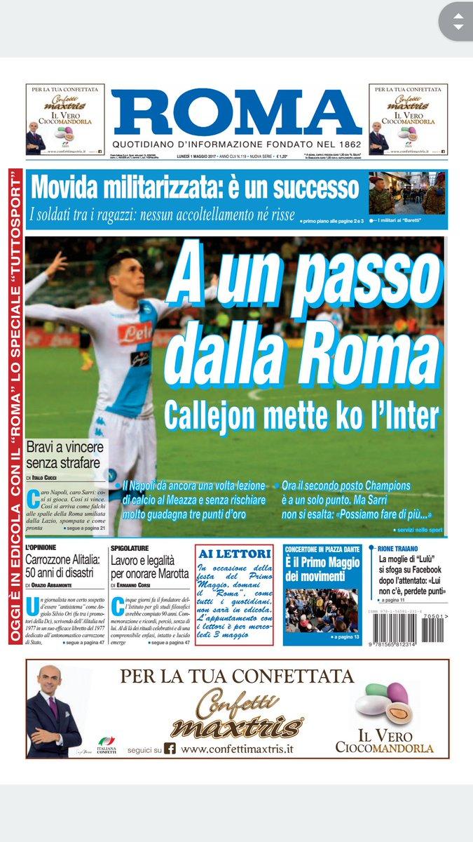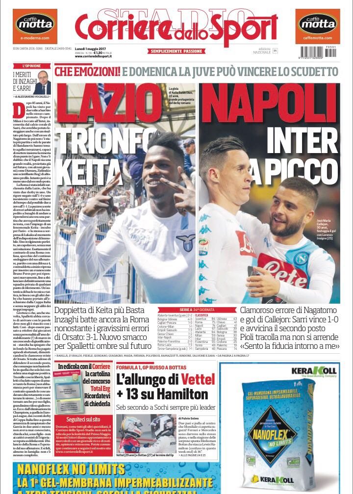 Sul Corriere dello Sport si viaggia da Roma a Milano, dall’Olimpico a San Siro: “Lazio, trionfo Keita“, “Napoli, Inter a picco“. Sulla Juve: “E domenica prossima la Juve può vincere lo scudetto“.