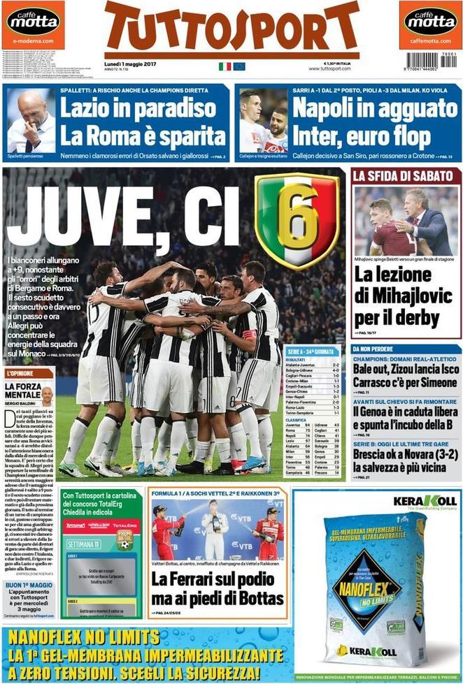 Tuttosport anticipa la festa: “Juve, ci 6“, riferimento ovviamente al sesto scudetto consecutivo ormai ad un passo. Di spalla, invece, spazio al Torino: “La lezione di Mihajlovic per il derby“. In taglio alto spazio al “Napoli in agguato“.