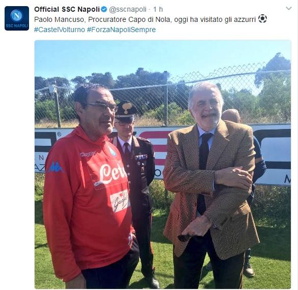 La squadra partenopea, così come certifica una foto pubblicata su Twitter dal club azzurro, ha ricevuto oggi al centro sportivo di Castel Volturno Paolo Mancuso, Procuratore Capo di Nola, che si è lasciato fotografare insieme al mister Maurizio Sarri.
