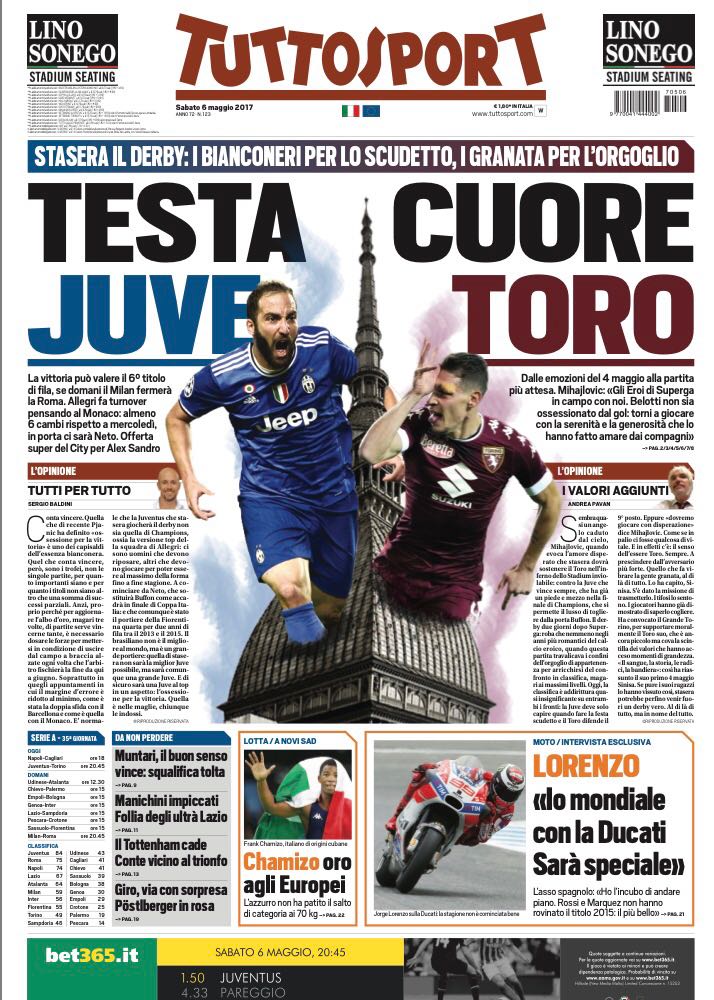 Tuttosport apre inevitabilmente con il derby di Torino: “Testa Juve, Cuore Toro“.