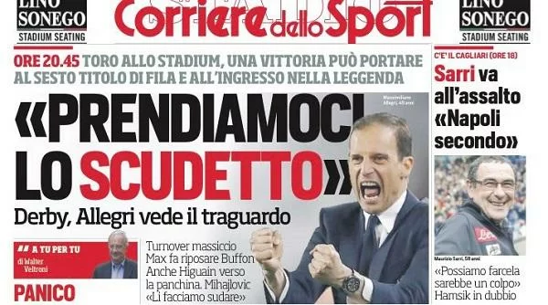 Il Corriere dello Sport titola con un virgolettato di Allegri: “Prendiamoci lo scudetto“. In taglio alto invece spazio alla vicenda Muntari: “Giustizia è fatta“. Di spalla c’è spazio anche per le parole di Sarri, alla ricerca dell’aggancio alla Roma: “Napoli secondo“.