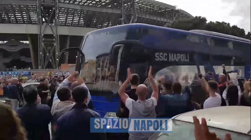Il pullman azzurro ha dunque da poco varcato i cancelli dello stadio per la penultima volta in stagione (l’ultima gara sarà con la Fiorentina), accolto tra due ali di folla e l’incitamento dei tifosi, accorsi in massa per provare a riuscire nel sorpasso ai giallorossi.