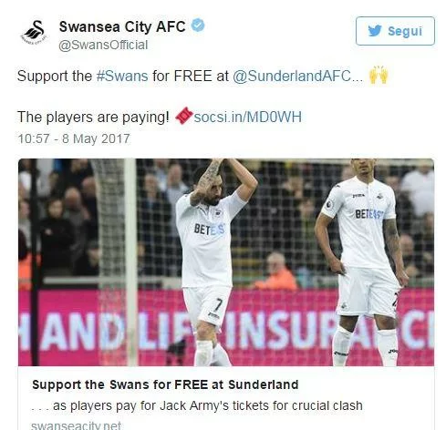 La prossima partita vedrà lo Swansea contro il retrocesso Sunderland e la squadra vuole tutti i tifosi a rapporto. Secondo quanto riferito da Paul Clement, allenatore dei gallesi, i giocatori hanno avuto una idea brillante. Il centrocampista Leon Britton ha proposto di pagare i 3000 biglietti per la trasferta ai tifosi che ne avessero fatto richiesta. Proposta subito accettata e rilanciata sul profilo Twitter del club.