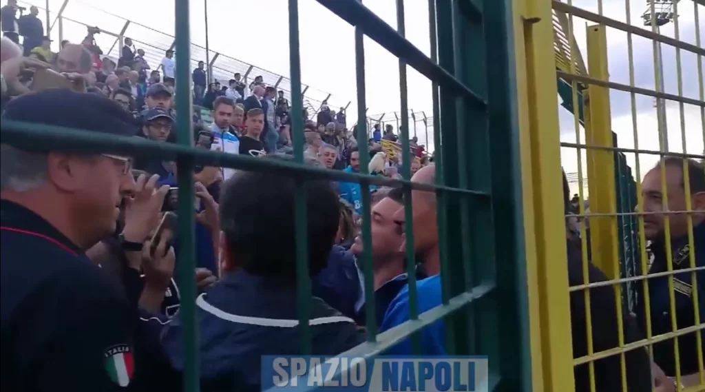 Tanti i tifosi vogliosi di uno scatto, una vera e propria ressa, con l’ex azzurro costretto a esclamare: “Cinque minuti che vado a giocare!“