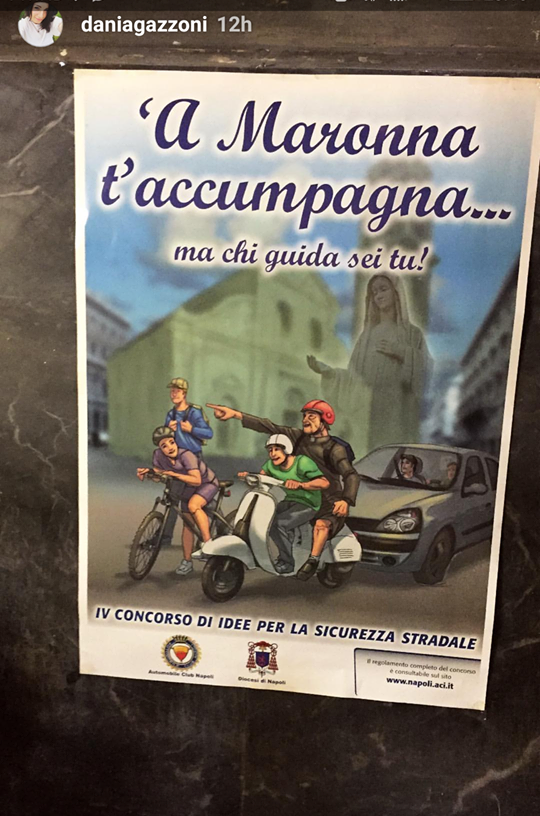 Ultimo esempio lampante è dato dalla moglie di Giaccherini che, sul suo profilo Instagram, ha postato una foto di una divertente locandina di un concorso di idee per la sicurezza stradale. A sorprendere lady Giaccherini, in particolare, il detto in napoletano lì scritto: “A Maronna t’accumpagna… ma chi guida sei tu!“.