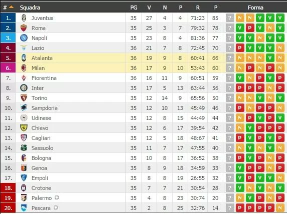 Ad aprire le danze era stato il solito Conti, arrivato a ben 8 reti stagionali. Nel finale di partita il pari di Deulofeu. Con questo pareggio l’Atalanta si assicura almeno il sesto posto in classifica che vuol dire certezza dei preliminari di Europa League per il prossimo anno. Grande risultato per l’Atalanta che torna in Europa 26 anni dopo l’ultima volta.