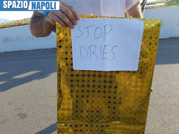 “Proviamoci un’ultima volta. O la va, o la spacca“. Mimmo chiede anche un permesso al lavoro e nella giornata di ieri già dalle 16 era lì, sotto il cocente Sole di Castel Volturno insieme ad un’altra ventina di persone. Sono ormai le 18, ma dal centro sportivo ancora nessuno è venuto fuori. Ad allietare l’attesa dei supporters azzurri c’è un cane, presumibilmente abbandonato poco più avanti da padroni senza cuore, in cerca di acqua e cibo. Ha gli occhioni colmi d’amore e il viso affaticato, però la voglia di giocare con i bambini presenti è immensa. Si fa rincorrere, accarezzare. Una signora poi lo disseta con una bottiglia d’acqua che aveva in macchina e gli lascia un pacco di salatini da mangiare, che vengono immediatamente polverizzati dal cucciolone in pochi istanti. Dopodiché iniziano i primi movimenti dal centro sportivo: il primo ad uscire è Strinic, che va via. Poi subito dopo Rog, e Giaccherini. L’esterno ex Bologna, dimostrando ancora una volta la sua generosità, non sa resistere al richiamo di una decina di bambini che sul ciglio della strada chiedono qualche autografo. Lui accosta l’auto e acconsente alla richiesta. Tanta felicità nel volto di questi piccoli tifosi, ci scappa anche qualche selfie con i genitori che li hanno accompagnati. Lo stesso Mimmo non sa resistere alla tentazione, perché ‘Un calciatore del Napoli è sempre n calciatore del Napoli’. Intanto il nostro tifoso ha preparato un cartello con su scritto “Stop Dries“, da piazzare davanti l’auto del belga nella speranza che questi si fermi.