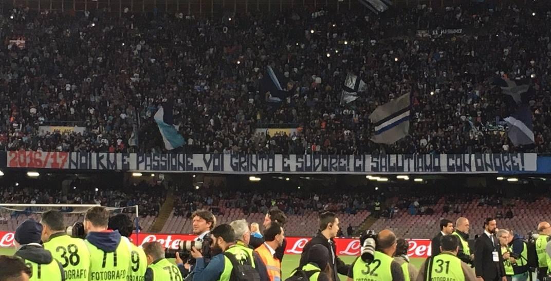 Alla fine della prima frazione di gioco gli azzurri sono meritatamente in vantaggio, ma lo spettacolo non manca in tutto l’impianto di Fuorigrotta, con cori ed applausi che non si lesinano. Inoltre la Curva A ha voluto omaggiare la squadra azzurra con uno splendido striscione.