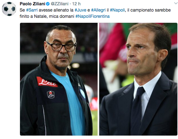 Che poi ha proseguito: “Se Sarri avesse allenato la Juve e Allegri il Napoli, il campionato sarebbe finito a Natale, mica domani”.
