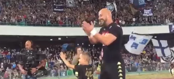 Pepe Reina emozionato e felice dopo il saluto al pubblico partenopeo all’ultima sfida stagionale al San Paolo. Il portiere azzurro ha festeggiato la vittoria contro la Fiorentina sotto la curva con i suoi figli.