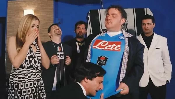 Si perché i comici de “Ultimo Stadio”, su Canale 21, hanno inscenato la parodia de “O’ Zappatore“, famosa commedia del compianto Mario Merola. Nella scena si vede un gruppo di tifosi napoletani, ma di fede bianconera, festeggiare il tricolore. Tra questi c’è anche il figlio de “O’ Zappatore” che viene raggiunto dal padre. Dopo un primo dialogo il tutto so conclude con il padre che dice al figlio la celebre frase: “Addenocchiate e vaseme… ‘sta maglia!“.