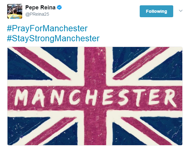 Anche il portiere del Napoli Pepe Reina, emotivamente colpito dalla vicenda, ha pubblicato sul proprio profilo Twitter un’immagine piuttosto eloquente, con cui spinge Manchester ad essere forte ed a ripartire.