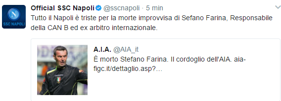 Anche il Napoli si è unito al dolore con un messaggio comparso pochi minuti fa sul profilo Twitter ufficiale: “Tutto il Napoli è triste per la morte improvvisa di Sefano Farina, Responsabile della CAN B ed ex arbitro internazionale”