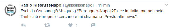 “Napoli? Piace in Italia, ma non solo. Tanti club europei lo cercano e mi chiamano. Presto altre news” si legge sul profilo twitter della radio partenopea.