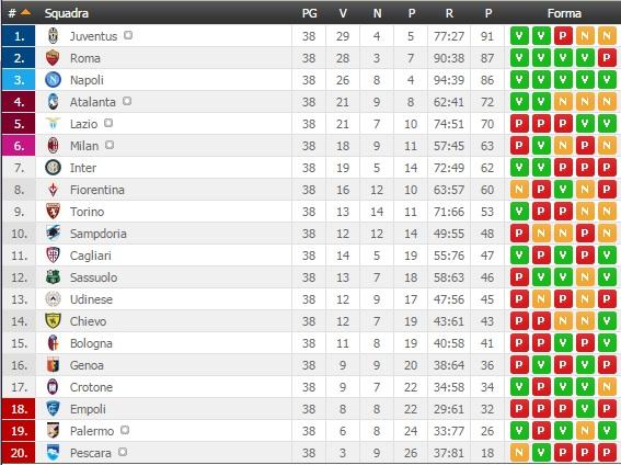 QUESTA LA CLASSIFICA FINALE DELLA SERIE A 2016/17: