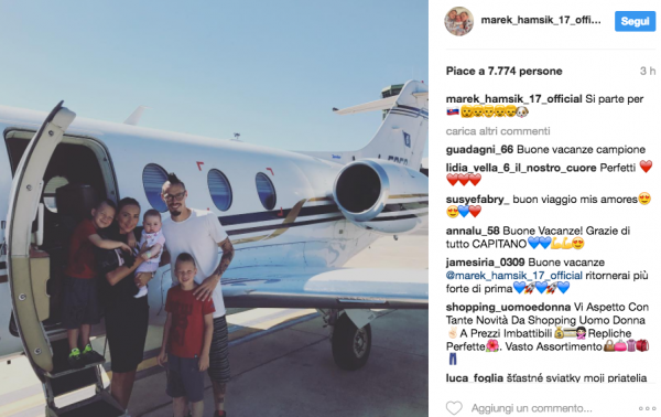 Il capitano del Napoli, Marek Hamsik, poco fa ha pubblicato una foto su Instagram, che lo ritrae insieme a sua moglie ed i loro tre figli, in procinto di salire sull’aereo con destinazione Slovacchia. “Si parte per la Slovacchia”, scrive il numero 17 azzurro come commento alla foto. Insomma, un po’ di meritato riposo in famiglia per il capitano, per poi ripartire forti ancora più di prima.