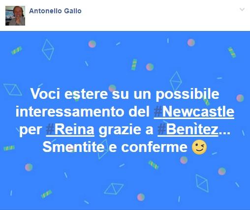 Questo il messaggio scritto su Facebook: “Voci estere su un possibile interessamento del #Newcastle per #Reina grazie a #Benìtez… Smentite e conferme“.