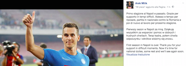 “La prima stagione al Napoli è passata”: inizia così il messaggio che l’attaccante polacco del Napoli, Arek Milik, ha lasciato sul suo profilo Facebook.