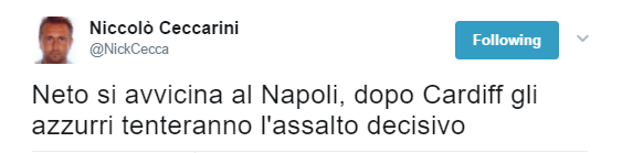Come riportato dall’esperto di mercato, Niccolò Ceccarini, giornalista di Mediaset, il Napoli starebbe pensando anche a Neto. Dopo Cardiff – si legge sul profilo Twitter del giornalista – il Napoli tenterà l’assalto.