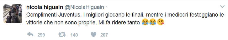 “Complimenti alla Juventus per la grande annata disputata. I migliori giocano le finali, mentre i mediocri festeggiano le sconfitte altrui. Un abbraccio a tutti”, le parole apparse poco fa sul suo profilo Twitter.