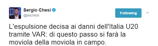 Emblematico il tweet del giornalista Sergio Chesi: “L’espulsione decisa ai danni dell’Italia U20 tramite VAR: di questo passo si farà la moviola della moviola in campo“. Come dargli torto…