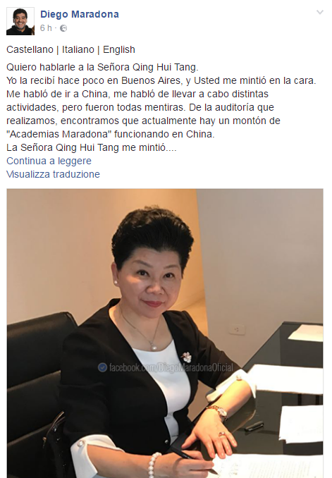 La Signora Qing Hui Tang mi ha mentito. Voglio che sia chiaro a tutto il mondo che queste accademie possono anche portare il mio nome, ma non avranno mai il mio lavoro, né i miei venti anni di esperienza da calciatore. A breve, grazie all’ambasciata argentina, avrò il piacere di visitare la Cina per incontrare il presidente Xi Jinping, un grande appassionato di calcio come molti di noi. E avrò l’opportunità di ritrovarmi faccia a faccia con questa Signora, in una conciliazione durante la quale le dirò di persona che è una bugiarda.