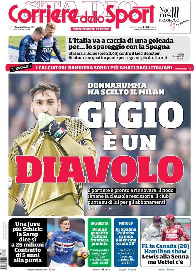 Il Corriere dello Sport titola con: “Gigio è un diavolo“, chiari riferimento al futuro di Donnarumma: il portiere è pronto a rinnovare, si legge ancora sul quotidiano. In taglio alto spazio all’Italia di Ventura che “Va a caccia di una goleada per… lo spareggio con la Spagna“. In taglio basso invece ancora calciomercato con “Una Juve più Schick: la Samp dice sì a 25 milioni. Contratto di 5 anni alla punta“.