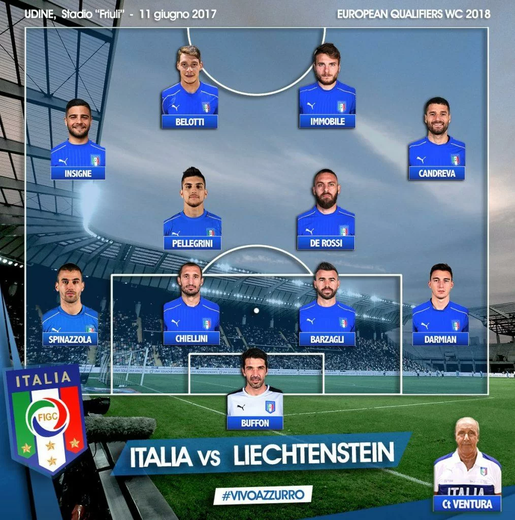Lorenzo Insigne nuovamente in campo dal 1′, questa volta con la 10 sulle spalle. Ventura conferma il 4-2-4 contro il Liechtenstein, ma cambia alcuni interpreti: esordio in un match non amichevole per Pellegrini, che sostituisce l’infortunato Marchisio. Spinazzola preferito ancora su Conti. Out Bonucci, diffidato, al suo posto Barzagli.