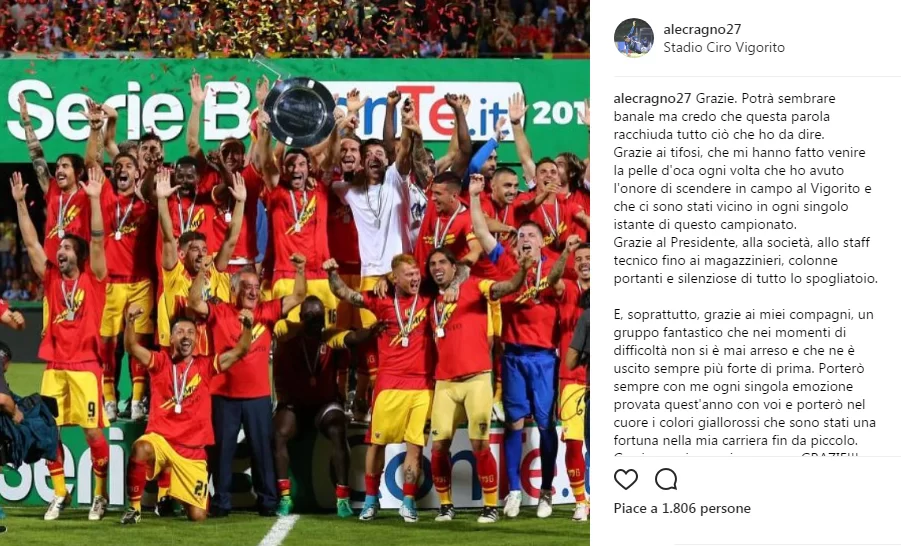 “Grazie. Potrà sembrare banale ma credo che questa parola racchiuda tutto ciò che ho da dire – spiega in un messaggio su Instagram – Grazie ai tifosi, che mi hanno fatto venire la pelle d’oca ogni volta che ho avuto l’onore di scendere in campo al Vigorito e che ci sono stati vicino in ogni singolo istante di questo campionato.