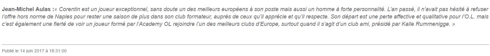 Jean–Michel Aulas, presidente del Lione, ha commentato sul sito ufficiale del club francese la cessione di Corentin Tolisso al Bayern Monaco di Carlo Ancelotti. Il patron francese, inoltre, è ritornato anche sulla vicenda, della scorsa estate, Tolisso-Napoli. Queste le sue parole: