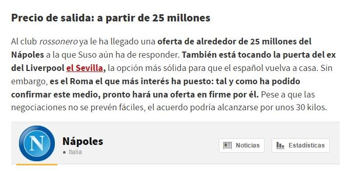 Continuano a circolare voci, il mercato entra sempre di più nella fase calda. In casa Napoli, ci sono importanti novità, che arrivano dalla Spagna. Secondo As, noto quotidiano spagnolo, infatti, il Napoli è fortemente interessato a Suso, esterno offensivo del Milan. Gli azzurri, dopo un primo iniziale sondaggio, avrebbero formulato un’offerta ufficiale ai rossoneri: 25 milioni di euro.